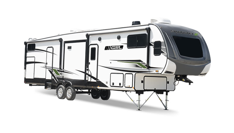 Popular among RVers who travel extensively, fifth wheels are designed for easier, more stable towing. Living space is maximized with additional over-cab space. This camping trailer—affectionately nicknamed a "fiver"—is a favorite of many, especially those taking extended trips in their RV. The prominent overhang resting above the tow truck bed is frequently employed as a bedroom suite, a living room, even a kitchen.