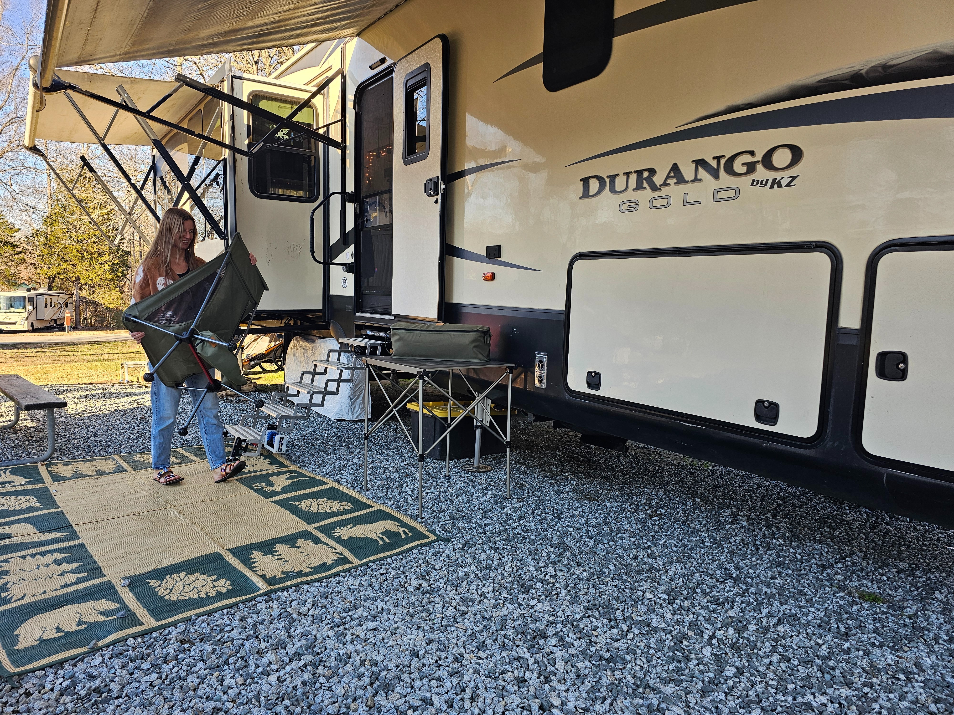 Our first step is to secure everything outside the RV that could become airborne or damaged by the elements. Camping chairs, toys, and even the area rug get tucked away for safekeeping.