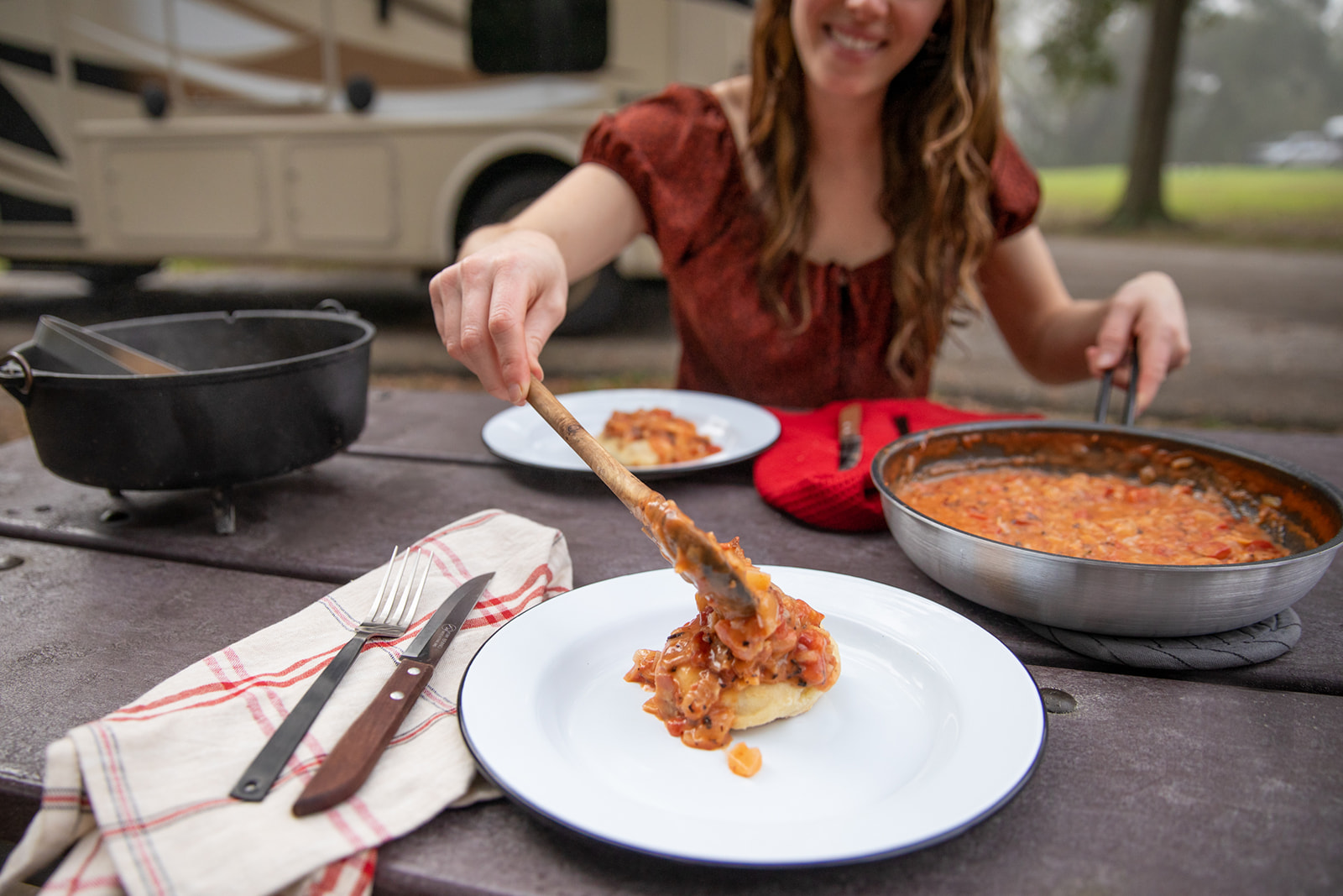 Achieving the perfect golden, flaky biscuit can be a challenge, even when you’re not cooking them in a dutch oven. Traditional kitchen ovens help regulate and maintain a steady heat—which is sometimes tricky when you’re cooking outside. To help with this, try cooking over coals instead of firewood. Coals get hotter and burn longer and more steadily than wood. Placing hot coals on top of the lid will also help circulate the heat and cook the biscuits more evenly. Feel free to periodically check on the biscuits as well. When they begin to brown on top, you know they’re good to go. (We flipped our biscuits to ensure a perfect golden brown on both sides––rather than potentially scorching the bottoms.)